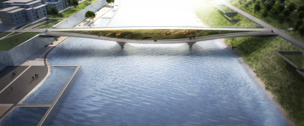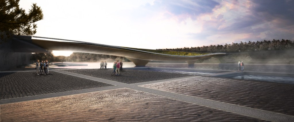 Seasonal connection, spans at variable heights over the Heshui River, aiming to provide a contemporary typology through curvilinear geometry, material coherency and structural innovative solutions.