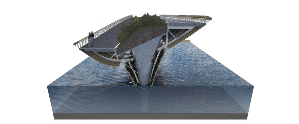 The bridge splits the pedestrian experience from the vehicular experience: the pedestrian experience firstly brings the users as close as possible to the river, rather than alienating them from the “obstacle”, shifting from witnesses to active members of the landscape, fostering social interaction and secondly, it envelops the division with a central green garden, which comprehends seasonal flowers, creating a diverse landscape, unceasingly changing ever colourful.
