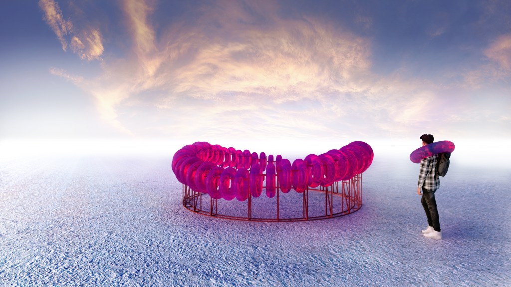 Ice Ice Baby consists of 100 no.9 pink lifesavers, 49 of them will be displayed as part of the installation, while the other 51 will be given away to visitors (these will be randomly distributed throughout the days and the site.) This whimsical installation of 21.24sqm (2.6m circle radius) will generate a pink at-mosphere due to the transparency of the lifesaver’s material.